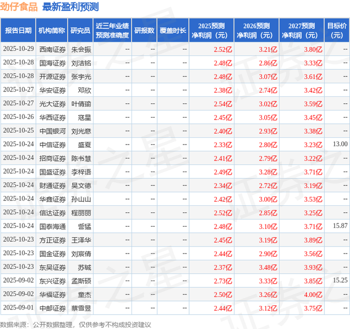 海通国际证券集团有限公司Huijing Yan,Yuxuan Zhang,Meng Zi近期对劲仔食品进行研究并发布了研究报告《2025年三季报点评:营收顺利转正,环比逐步改善》,下调劲仔食品目标价至15.87元,给予增持评级。
