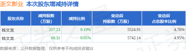 证券之星消息,11月5日浙文影业发布公告《浙文影业:关于5%以上股东权益变动触及5%整数倍的提示性公告》,其股东钱文龙于2025年10月23日至2025年11月5日间合计减持277.54万股,占公司目前总股本的0.2392%,变动期间该股股价上涨5.23%,截止11月5日收盘报3.82元。