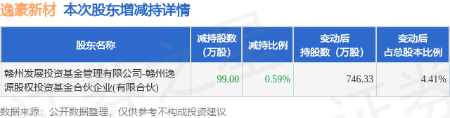 证券之星消息,11月7日逸豪新材发布公告《逸豪新材:关于原持股5%以上股东减持计划完成的公告》,其股东赣州发展投资基金管理有限公司-赣州逸源股权投资基金合伙企业(有限合伙)于2025年10月29日至2025年11月6日间合计减持99.0万股,占公司目前总股本的0.5856%,变动期间该股股价下跌3.6%,截止11月6日收盘报27.32元。