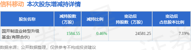 证券之星消息,11月10日信科移动发布公告《信科移动:持股5%以上股东及其一致行动人减持股份计划实施完毕暨减持股份结果公告》,其股东国开制造业转型升级基金(有限合伙)于2025年10月16日至2025年11月10日间合计减持1584.55万股,占公司目前总股本的0.4635%,变动期间该股股价下跌0.58%,截止11月10日收盘报6.83元。