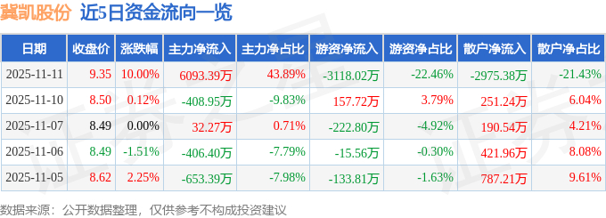 11月11日的资金流向数据方面,主力资金净流入6093.39万元,占总成交额43.89%,游资资金净流出3118.02万元,占总成交额22.46%,散户资金净流出2975.38万元,占总成交额21.43%。