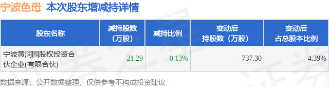 证券之星消息,11月13日宁波色母发布公告《宁波色母:关于公司控股股东、实际控制人控制的特定股东减持计划时间届满暨减持结果的公告》,其股东宁波黄润园股权投资合伙企业(有限合伙)于2025年9月30日合计减持21.29万股,占公司目前总股本的0.1267%,变动期间该股股价下跌3.41%,截止9月30日收盘报18.97元。