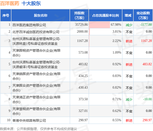 根据百洋医药2025年三季报公布的十大股东详情如下: