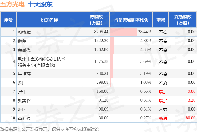 根据五方光电2025年三季报公布的十大股东详情如下: