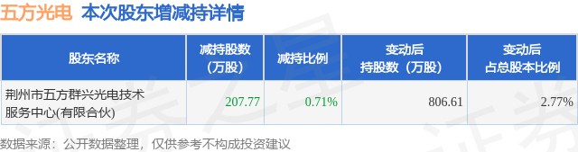证券之星消息,11月14日五方光电发布公告《五方光电:关于控股股东、实际控制人的一致行动人股份减持计划实施完成暨期限届满的公告》,其股东荆州市五方群兴光电技术服务中心(有限合伙)于2025年10月25日至2025年11月14日间合计减持207.77万股,占公司目前总股本的0.7124%,变动期间该股股价下跌5.39%,截止11月14日收盘报14.75元。