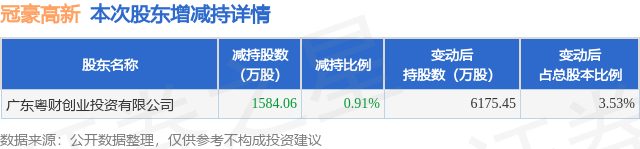 证券之星消息,11月17日冠豪高新发布公告《冠豪高新:冠豪高新简式权益变动报告书》,其股东广东粤财创业投资有限公司于2025年10月20日至2025年11月14日间合计减持1584.06万股,占公司目前总股本的0.905%,变动期间该股股价上涨3.01%,截止11月14日收盘报3.42元。