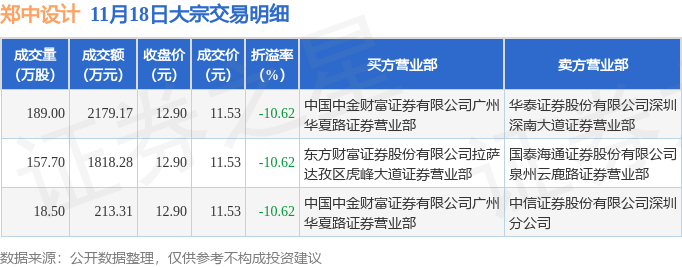 证券之星消息,11月18日郑中设计发生大宗交易,交易数据如下: