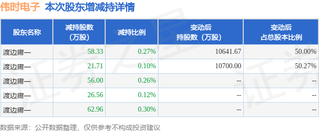 证券之星消息,11月18日伟时电子发布公告《伟时电子:伟时电子股份有限公司简式权益变动报告书》,其股东渡边庸一于2025年10月15日至2025年11月18日间合计减持225.56万股,占公司目前总股本的1.0597%,变动期间该股股价下跌0.29%,截止11月18日收盘报20.36元。
