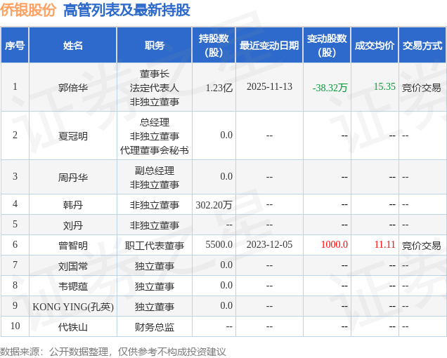 侨银股份近半年内的董监高及核心技术人员增减持详情如下: