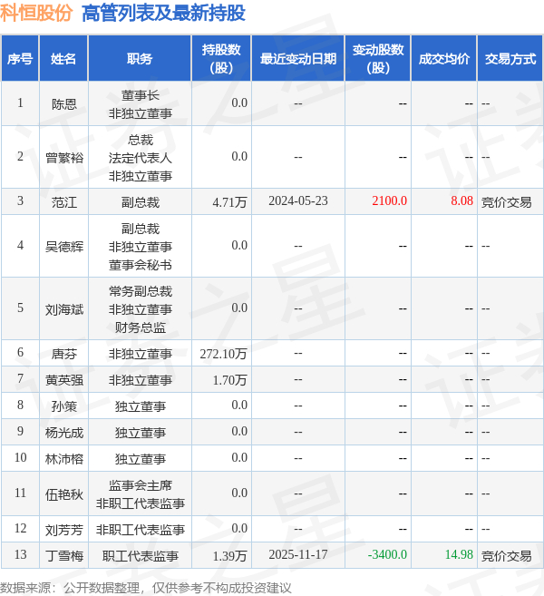 科恒股份的高管列表及最新持股情况如下: