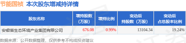 证券之星消息,11月19日节能国祯发布公告《节能国祯:关于持股5%以上股东增持公司股份超过1%的公告》,其股东安徽省生态环境产业集团有限公司于2025年11月17日至2025年11月18日间合计增持676.08万股,占公司目前总股本的0.9927%,变动期间该股股价下跌0.53%,截止11月18日收盘报9.42元。