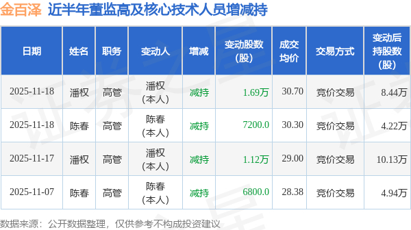 金百泽近半年内的董监高及核心技术人员增减持详情如下: