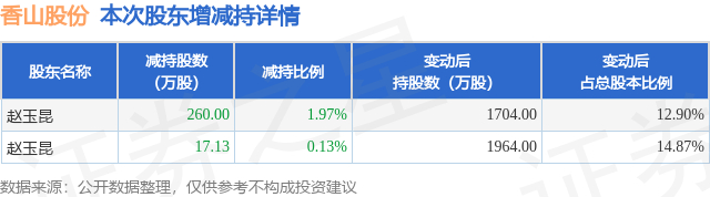 证券之星消息,11月21日香山股份发布公告《香山股份:关于持股5%以上股东权益变动触及1%整数倍暨股份减持计划实施完毕的公告》,其股东赵玉昆于2025年11月19日至2025年11月20日间合计减持277.13万股,占公司目前总股本的2.0983%,变动期间该股股价下跌2.89%,截止11月20日收盘报34.31元。