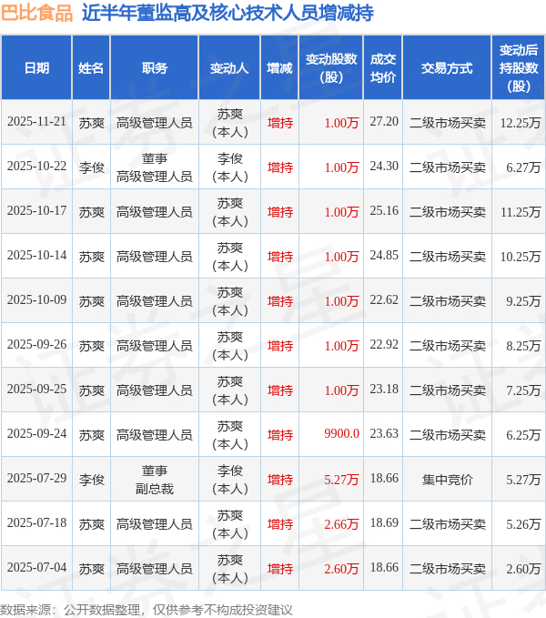 巴比食品近半年内的董监高及核心技术人员增减持详情如下:
