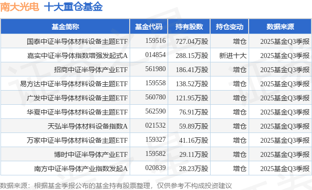 根据2025基金Q3季报公募基金重仓股数据,重仓该股的公募基金共19家,其中持有数量最多的公募基金为国泰基金的国泰中证半导体材料设备主题ETF。国泰中证半导体材料设备主题ETF目前规模为82.99亿元,最新净值1.3564(11月21日),较上一交易日下跌4.2%,近一年上涨18.48%。该公募基金现任基金经理为艾小军。艾小军在任的基金产品包括:国泰金融ETF联接A,管理时间为2014年1月13日至今,期间收益率为172.13%;国泰上证180金融ETF,管理时间为2014年1月13日至今,期间收益率为191.33%;国泰黄金ETF,管理时间为2014年1月13日至今,期间收益率为261.62%;国泰中证计算机主题ETF联接A,管理时间为2015年3月26日至今,期间收益率为-4.1%。