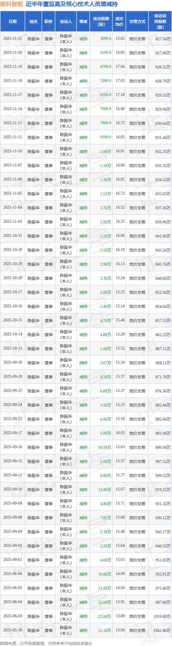 建科智能近半年内的董监高及核心技术人员增减持详情如下: