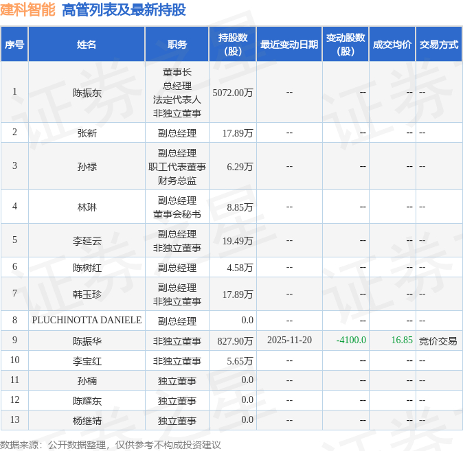建科智能的高管列表及最新持股情况如下: