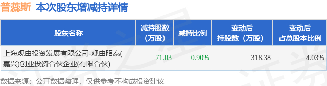 证券之星消息,11月24日普蕊斯发布公告《普蕊斯:简式权益变动报告书》,其股东上海观由投资发展有限公司-观由昭泰(嘉兴)创业投资合伙企业(有限合伙)于2025年11月10日至2025年11月24日间合计减持71.03万股,占公司目前总股本的0.899%,变动期间该股股价下跌5.77%,截止11月24日收盘报44.6元。