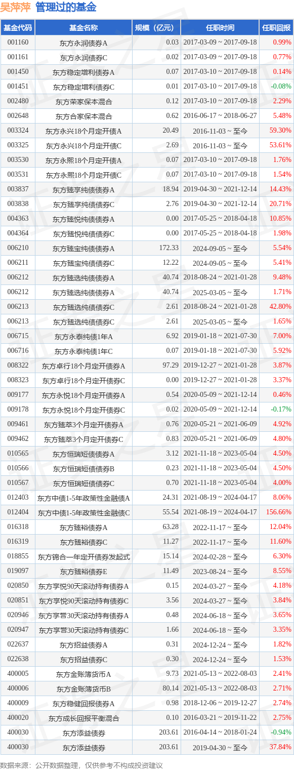 吴萍萍女士:中国国籍,中国人民大学应用经济学硕士。东方基金管理有限责任公司总经理助理,固定收益投资副总监,固定收益投资部总经理,公募投资决策委员会委员。曾任安信证券投资组资金交易员、民生加银基金管理有限公司专户投资经理。2015年11月加盟东方基金管理有限责任公司,曾任固定收益投资部副总经理、东方稳健回报债券型证券投资基金基金经理助理、东方添益债券型证券投资基金基金经理助理、东方利群混合型发起式证券投资基金基金经理助理、东方强化收益债券型证券投资基金基金经理助理、东方添益债券型证券投资基金基金经理、东方安心收益保本混合型证券投资基金(于2019年8月2日起转型为东方成长回报平衡混合型证券投资基金)基金经理、东方稳健回报债券型证券投资基金基金经理、东方成长回报平衡混合型证券投资基金基金经理、东方臻悦纯债债券型证券投资基金基金经理、东方合家保本混合型证券投资基金基金经理、东方永泰纯债1年定期开放债券型证券投资基金基金经理,现任东方永兴18个月定期开放债券型证券投资基金基金经理、东方添益债券型证券投资基金基金经理、东方臻裕债券型证券投资基金基金经理、东方锦合一年定期开放债券型发起式证券投资基金基金经理、东方享悦90天滚动持有债券型证券投资基金基金经理。曾任东方臻享纯债债券型证券投资基金基金经理。曾任东方永悦18个月定期开放纯债债券型证券投资基金基金经理。2020年5月21日至2021年6月9日担任东方臻萃3个月定期开放纯债债券型证券投资基金基金经理。2018年8月24日至2021年1月28日担任东方臻选纯债债券型证券投资基金基金经理。2019年12月27日至2021年1月28日担任东方卓行18个月定期开放债券型证券投资基金基金经理。2021年5月13日至2022年8月3日担任东方金账簿货币市场证券投资基金基金经理。2021年11月18日至2023年05月04日担任东方恒瑞短债债券型证券投资基金基金经理。曾任东方中债1-5年政策性金融债指数证券投资基金基金经理。2024年9月5日起任东方臻宝纯债债券型证券投资基金基金经理。2025年3月5日起任东方臻选纯债债券型证券投资基金基金经理。