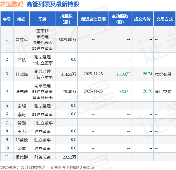 君逸数码的高管列表及最新持股情况如下: