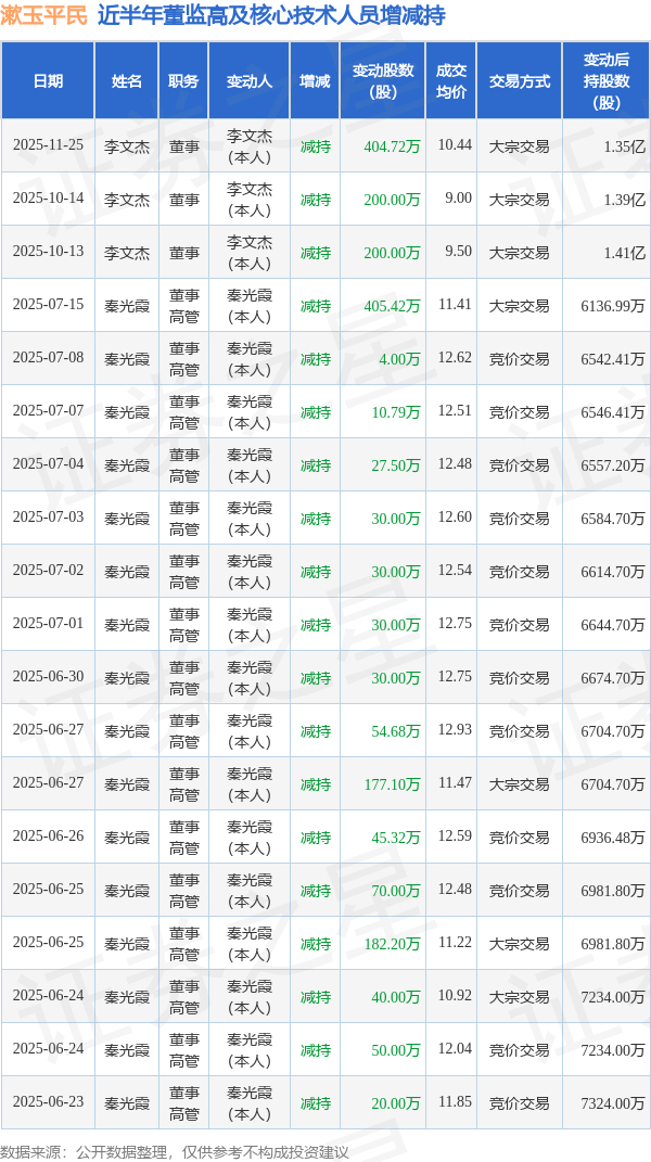 漱玉平民近半年内的董监高及核心技术人员增减持详情如下: