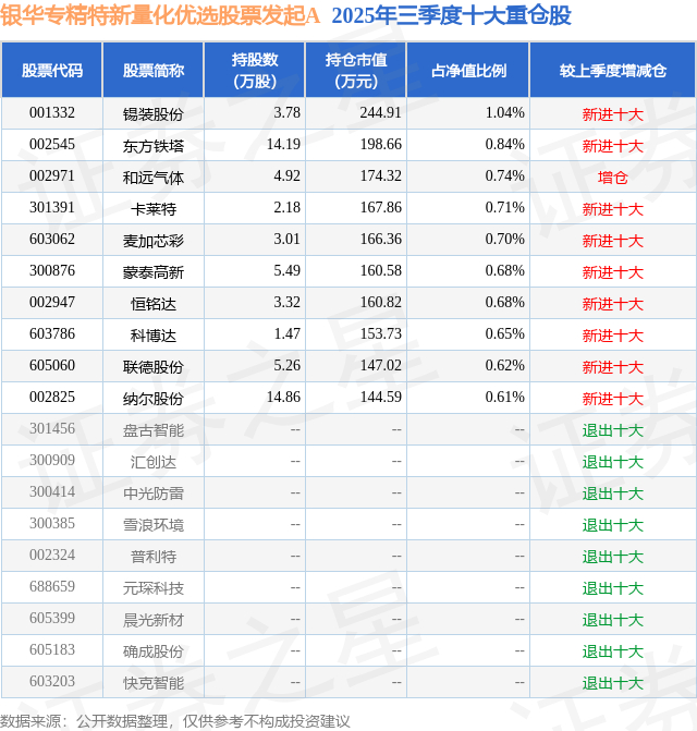 银华专精特新量化优选股票发起A的前十大重仓股如下: