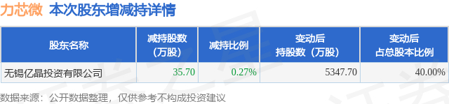 证券之星消息,12月1日力芯微发布公告《力芯微:简式权益变动报告书》,其股东无锡亿晶投资有限公司于2025年11月25日至2025年12月1日间合计减持35.7万股,占公司目前总股本的0.267%,变动期间该股股价上涨13.22%,截止12月1日收盘报48.22元。