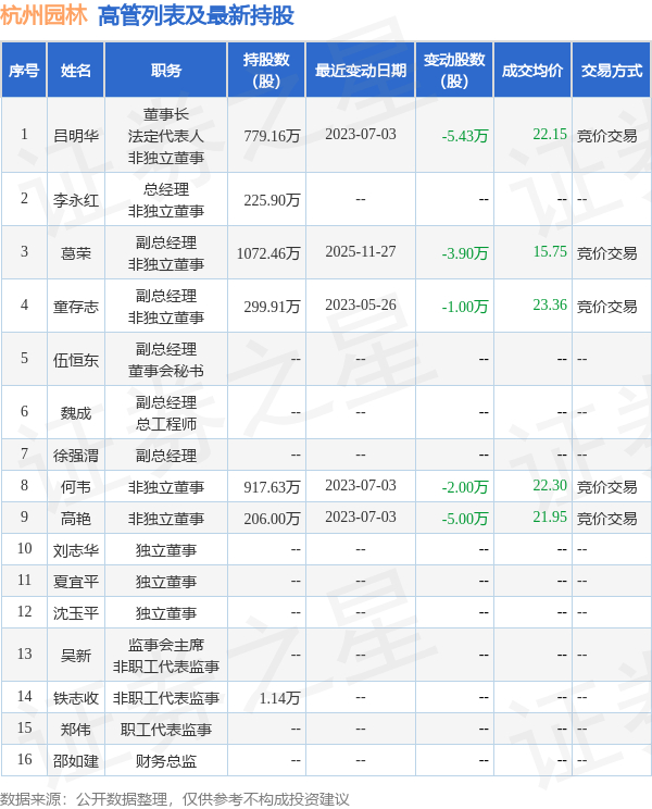 杭州园林的高管列表及最新持股情况如下: