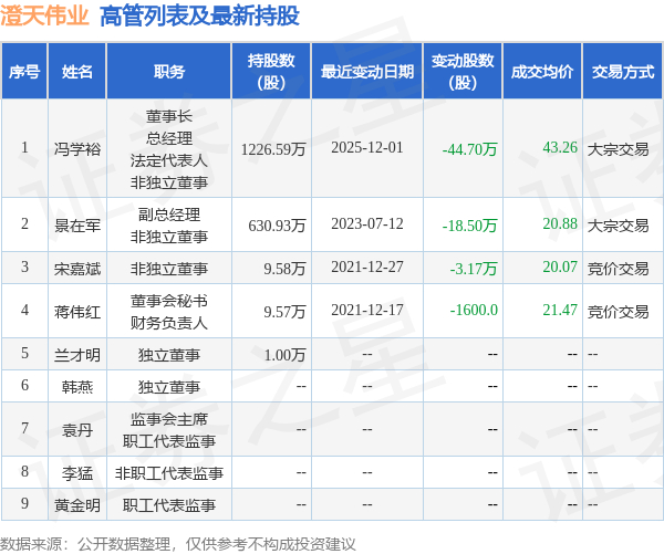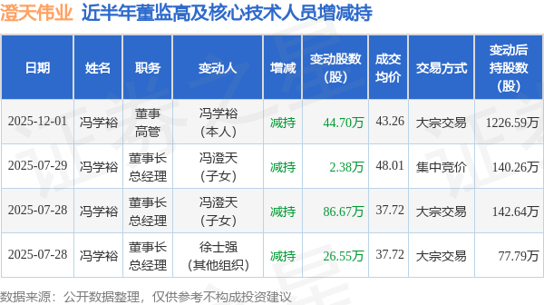 澄天伟业近半年内的董监高及核心技术人员增减持详情如下: