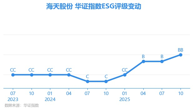 日前,华证指数公布了新一期(2025年10月31日)的ESG评级结果,海天股份(603759.SH)获得BB评级(华证指数评级为C起至AAA九档,C为最低档,AAA为其最高一级评级/AA为其第二档),上一期(2025年7月31日)ESG评级为B。本期ESG评级在16家水公用事业行业A股上市公司中排名第10(上一期排名第10)。