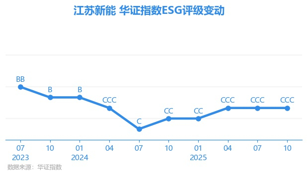 日前,华证指数公布了新一期(2025年10月31日)的ESG评级结果,江苏新能(603693.SH)获得CCC评级(华证指数评级为C起至AAA九档,C为最低档,AAA为其最高一级评级/AA为其第二档),上一期(2025年7月31日)ESG评级为CCC。本期ESG评级在20家独立电力生产商与能源贸易商行业A股上市公司中排名第16(上一期排名第16)。