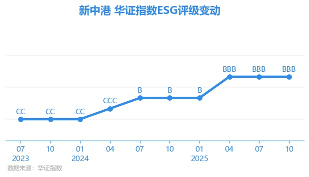 日前,华证指数公布了新一期(2025年10月31日)的ESG评级结果,新中港(605162.SH)获得BBB评级(华证指数评级为C起至AAA九档,C为最低档,AAA为其最高一级评级/AA为其第二档),上一期(2025年7月31日)ESG评级为BBB。本期ESG评级在58家电力公用事业行业A股上市公司中排名第10(上一期排名第11)。