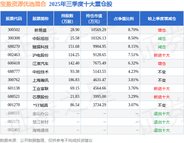 根据2025基金Q3季报公募基金重仓股数据,重仓该股的公募基金共8家,其中持有数量最多的公募基金为宝盈基金的宝盈资源优选混合。宝盈资源优选混合目前规模为12.15亿元,最新净值1.8295(12月2日),较上一交易日上涨0.07%,近一年上涨47.3%。该公募基金现任基金经理为赵国进。赵国进在任的基金产品包括:宝盈互联网沪港深混合,管理时间为2023年4月15日至今,期间收益率为25.08%;宝盈智慧生活混合A,管理时间为2025年10月25日至今,期间收益率为-2.7%。