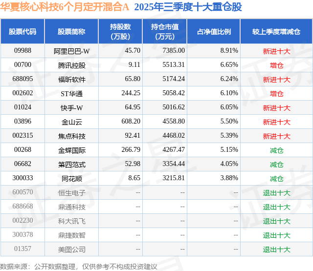 华夏核心科技6个月定开混合A的前十大重仓股如下: