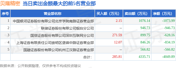 证券之星消息,沪深交易所2025年12月3日公布的交易公开信息显示,贝隆精密(301567)因日换手率达到30%的前5只证券登上龙虎榜。此次是近5个交易日内第3次上榜。