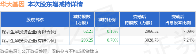 证券之星消息,12月3日华大基因发布公告《华大基因:关于持股5%以上股东减持计划期限届满暨实施情况的公告》,其股东深圳生华投资企业(有限合伙)于2025年9月9日至2025年11月3日间合计减持355.46万股,占公司目前总股本的0.8497%,变动期间该股股价下跌7.47%,截止11月3日收盘报49.19元。