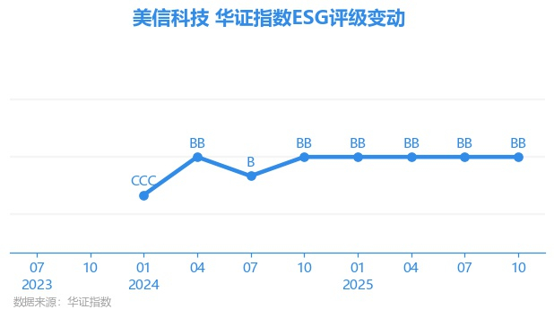 日前,华证指数公布了新一期(2025年10月31日)的ESG评级结果,美信科技(301577.SZ)获得BB评级(华证指数评级为C起至AAA九档,C为最低档,AAA为其最高一级评级/AA为其第二档),上一期(2025年7月31日)ESG评级为BB。本期ESG评级在531家电子设备、仪器和元件行业A股上市公司中排名第193(上一期排名第211)。