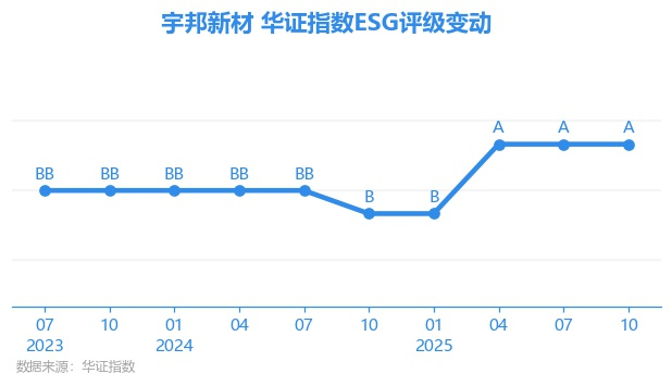 日前,华证指数公布了新一期(2025年10月31日)的ESG评级结果,宇邦新材(301266.SZ)获得A评级(华证指数评级为C起至AAA九档,C为最低档,AAA为其最高一级评级/AA为其第二档),上一期(2025年7月31日)ESG评级为A。本期ESG评级在531家电子设备、仪器和元件行业A股上市公司中排名第82(上一期排名第85)。