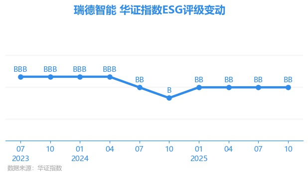 日前,华证指数公布了新一期(2025年10月31日)的ESG评级结果,瑞德智能(301135.SZ)获得BB评级(华证指数评级为C起至AAA九档,C为最低档,AAA为其最高一级评级/AA为其第二档),上一期(2025年7月31日)ESG评级为BB。本期ESG评级在531家电子设备、仪器和元件行业A股上市公司中排名第198(上一期排名第206)。