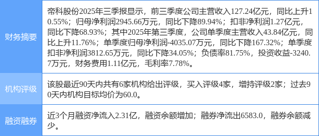 2025年11月2日,东吴证券研究员曾朵红,郭亚男,徐铖嵘发布了对帝科股份的研报《2025年三季报点评:银点波动影响Q3业绩收购晶凯拓展半导体布局》,该研报对帝科股份给出“买入”评级。研报中预计公司25-27年归母净利润为1.4/4.1/5.8亿元(25-27年前值为2.1/4.4/6.1亿元),同比-61%/+189%/+42%;基于公司高铜浆量产推进、并购协同及新业务拓展带动成长,维持“买入”评级。证券之星数据中心根据近三年发布的研报数据计算,该研报作者对此股的盈利预测准确度为38.44%。