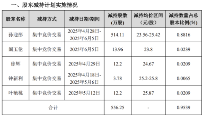 减持公告披露,2025年4月29日至6月5日期间,公司董事长孙迎彤、董事、副总经理阚玉伦等五位高管均在减持公司股份,合计减持公司556.56万股股份。其中,董事长孙迎彤减持比例最高,共减持514.11万股,减持比例为0.88%。经计算,孙迎彤本轮减持套现金额上限为1.31亿元。