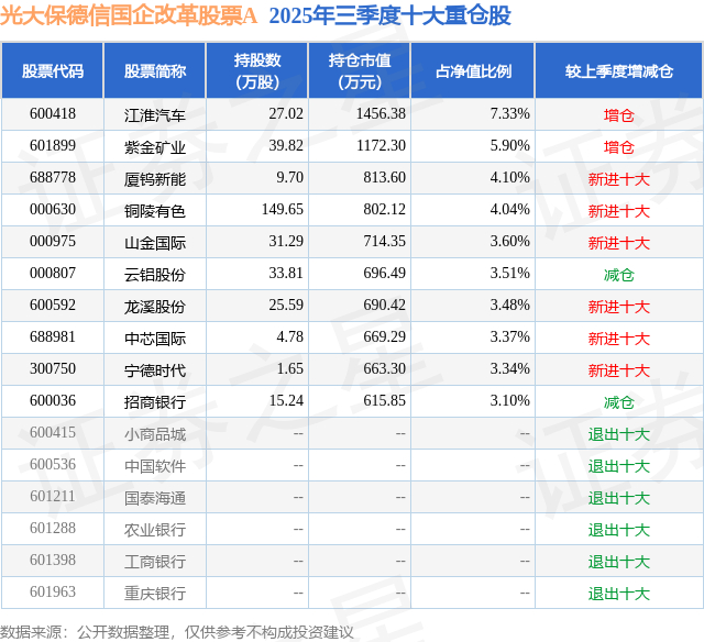根据2025基金Q3季报公募基金重仓股数据,重仓该股的公募基金共1家,其中持有数量最多的公募基金为光大保德信基金的光大保德信国企改革股票A。光大保德信国企改革股票A目前规模为1.99亿元,最新净值1.403(12月3日),较上一交易日上涨0.07%,近一年上涨9.01%。该公募基金现任基金经理为林晓凤 王明旭。林晓凤在任的基金产品包括:光大优势配置混合A,管理时间为2022年12月3日至今,期间收益率为-6.61%;光大高端装备混合A,管理时间为2023年12月30日至今,期间收益率为17.32%;光大保德信睿盈混合A,管理时间为2024年9月14日至今,期间收益率为23.76%。王明旭在任的基金产品包括:光大瑞和混合A,管理时间为2021年8月7日至今,期间收益率为19.24%;光大保德信智能汽车主题股票A,管理时间为2022年8月27日至今,期间收益率为-4.21%;光大保德信均衡精选混合A,管理时间为2025年3月19日至今,期间收益率为23.1%。