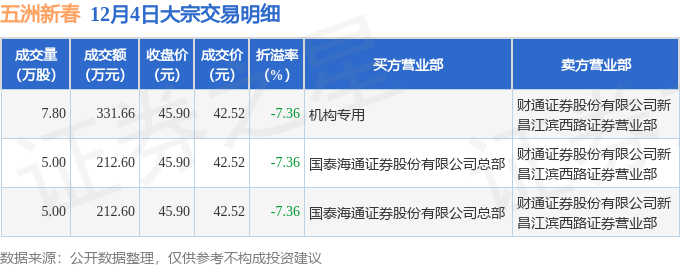 证券之星消息,12月4日五洲新春发生大宗交易,交易数据如下: