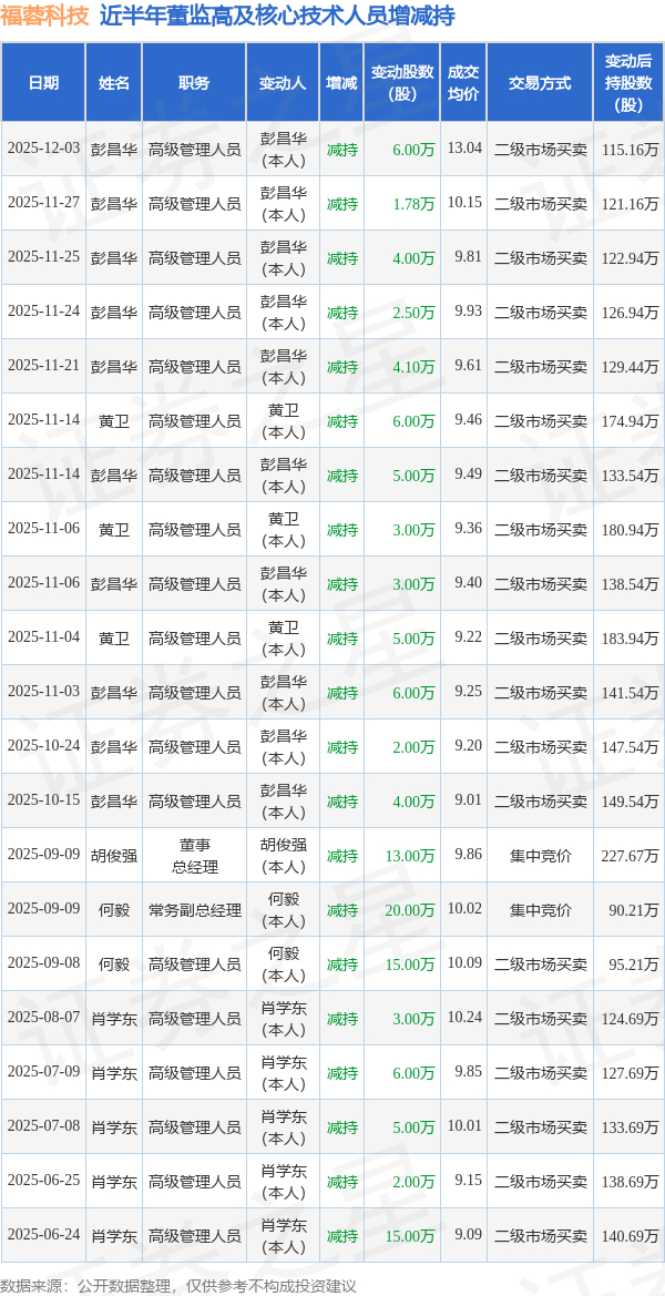 福蓉科技近半年内的董监高及核心技术人员增减持详情如下: