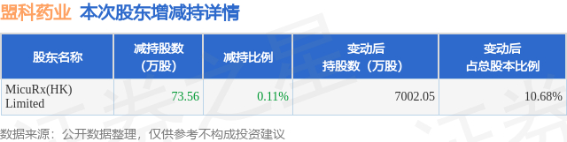 证券之星消息,12月4日盟科药业发布公告《盟科药业:上海盟科药业股份有限公司股东减持计划时间届满暨减持股份结果公告》,其股东MicuRx(HK) Limited于2025年9月5日至2025年12月4日间合计减持73.56万股,占公司目前总股本的0.1122%,变动期间该股股价下跌23.38%,截止12月4日收盘报6.13元。