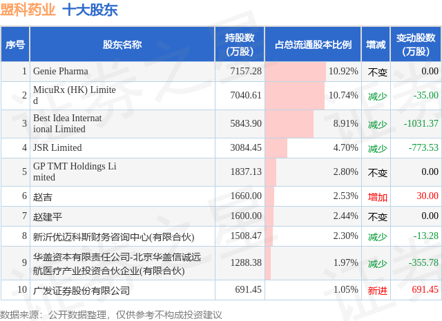 根据盟科药业2025年三季报公布的十大股东详情如下: