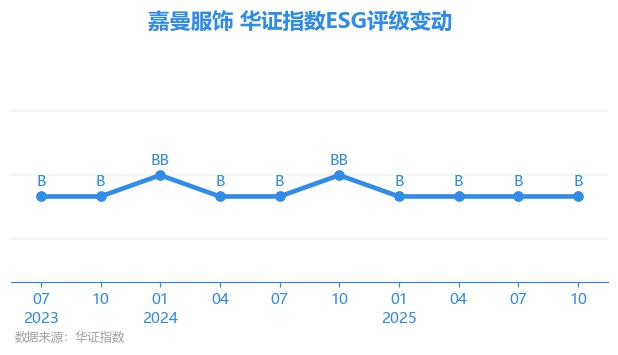 日前,华证指数公布了新一期(2025年10月31日)的ESG评级结果,嘉曼服饰(301276.SZ)获得B评级(华证指数评级为C起至AAA九档,C为最低档,AAA为其最高一级评级/AA为其第二档),上一期(2025年7月31日)ESG评级为B。本期ESG评级在116家纺织品、服装与奢侈品行业A股上市公司中排名第46(上一期排名第40)。