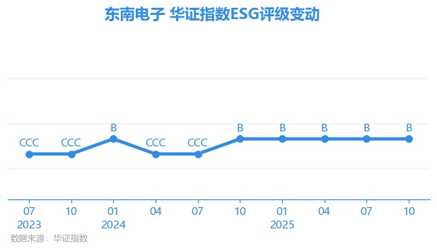 日前,华证指数公布了新一期(2025年10月31日)的ESG评级结果,东南电子(301359.SZ)获得B评级(华证指数评级为C起至AAA九档,C为最低档,AAA为其最高一级评级/AA为其第二档),上一期(2025年7月31日)ESG评级为B。本期ESG评级在148家家庭耐用消费品行业A股上市公司中排名第58(上一期排名第58)。