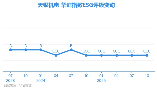 日前,华证指数公布了新一期(2025年10月31日)的ESG评级结果,天银机电(300342.SZ)获得CCC评级(华证指数评级为C起至AAA九档,C为最低档,AAA为其最高一级评级/AA为其第二档),上一期(2025年7月31日)ESG评级为CCC。本期ESG评级在148家家庭耐用消费品行业A股上市公司中排名第79(上一期排名第88)。