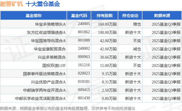 根据2025基金Q3季报公募基金重仓股数据,重仓该股的公募基金共11家,其中持有数量最多的公募基金为华宝基金的华宝多策略增长A。华宝多策略增长A目前规模为7.86亿元,最新净值0.5054(12月4日),较上一交易日上涨0.86%,近一年上涨21.32%。该公募基金现任基金经理为丁靖斐。丁靖斐在任的基金产品包括:华宝资源优选混合A,管理时间为2019年9月5日至今,期间收益率为244.62%;华宝国策导向混合A,管理时间为2020年7月30日至今,期间收益率为38.95%;